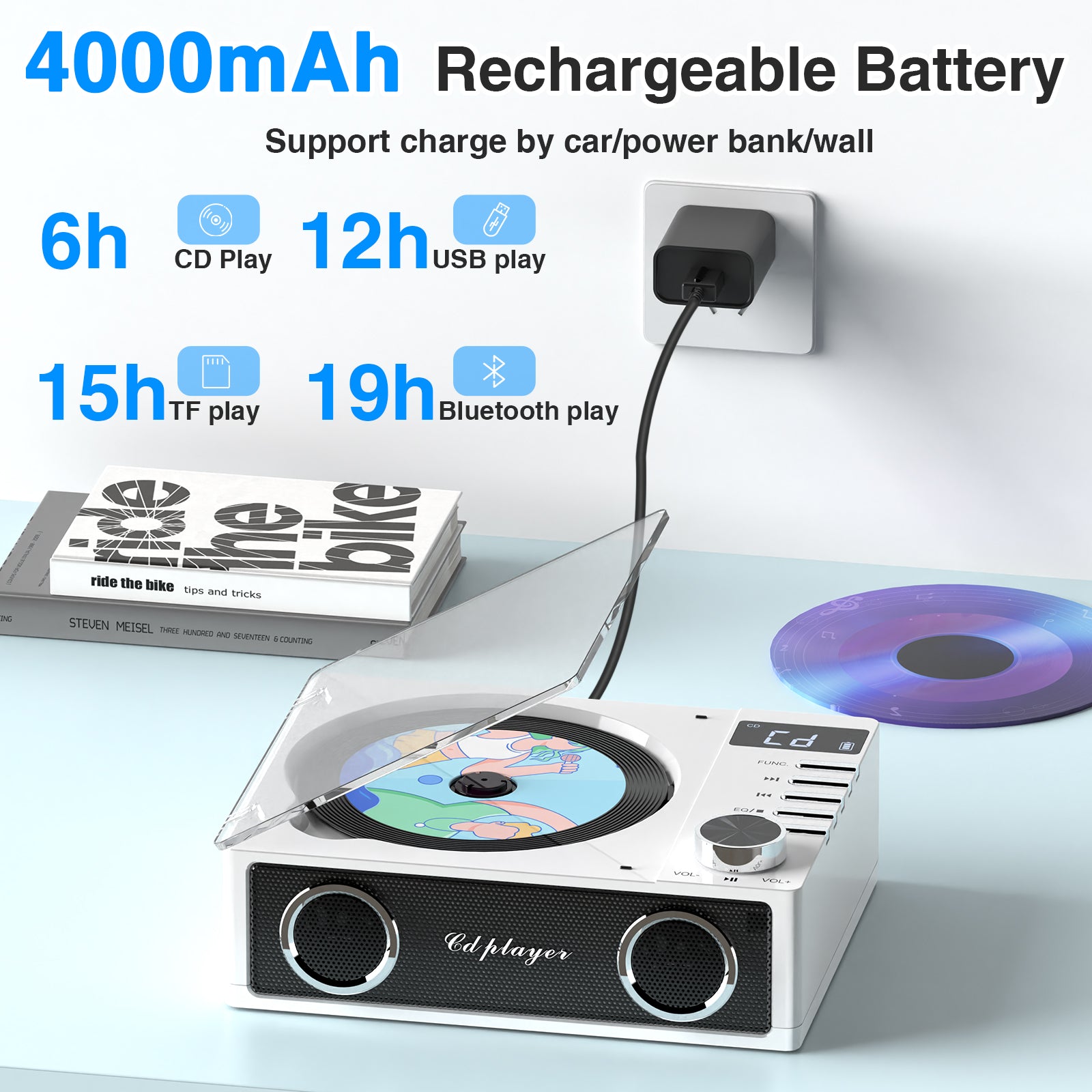 Bluetooth CD Players Portable with Remote Control, 4000mAh Rechargeable CD Player, CD Player with Speakers for Home, Supports USB, TF, AUX, Optical Input, 1 Count
