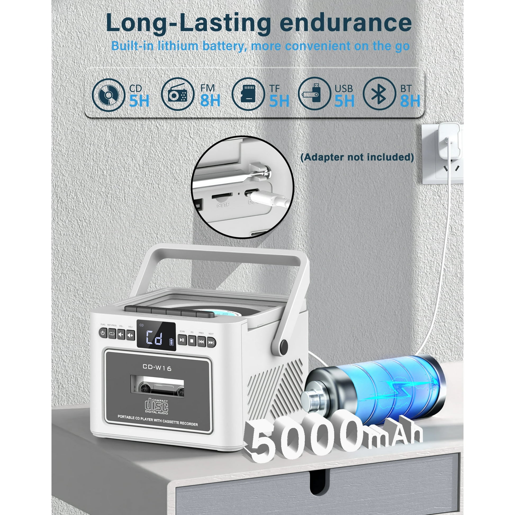 Greadio 5000mAh Rechargeable CD Player Boombox Cassette Player Combo with Bluetooth, FM, Music