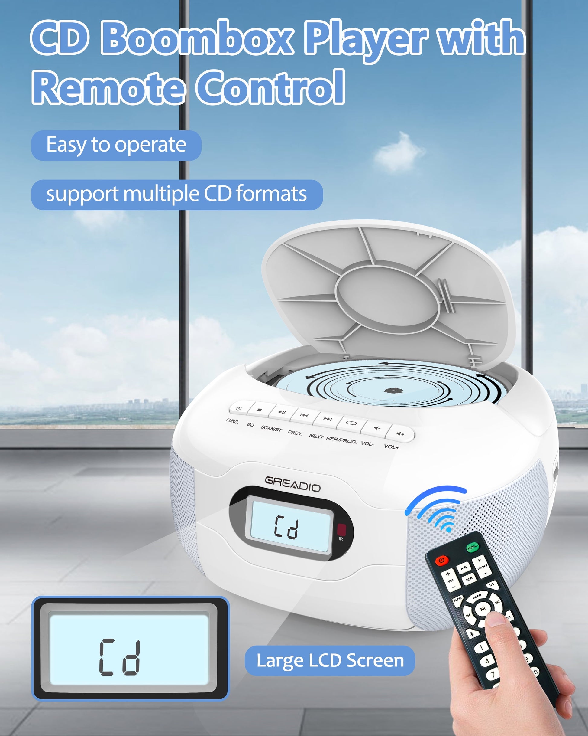 Greadio Boomboxes, CD Boombox, CD Player Boombox, Portable FM Radio CD Player with Bluetooth 5.1, LCD Display, AC Cord/Dry Battery Operation, TF/USB/AUX Port for Home,Senior,Kids