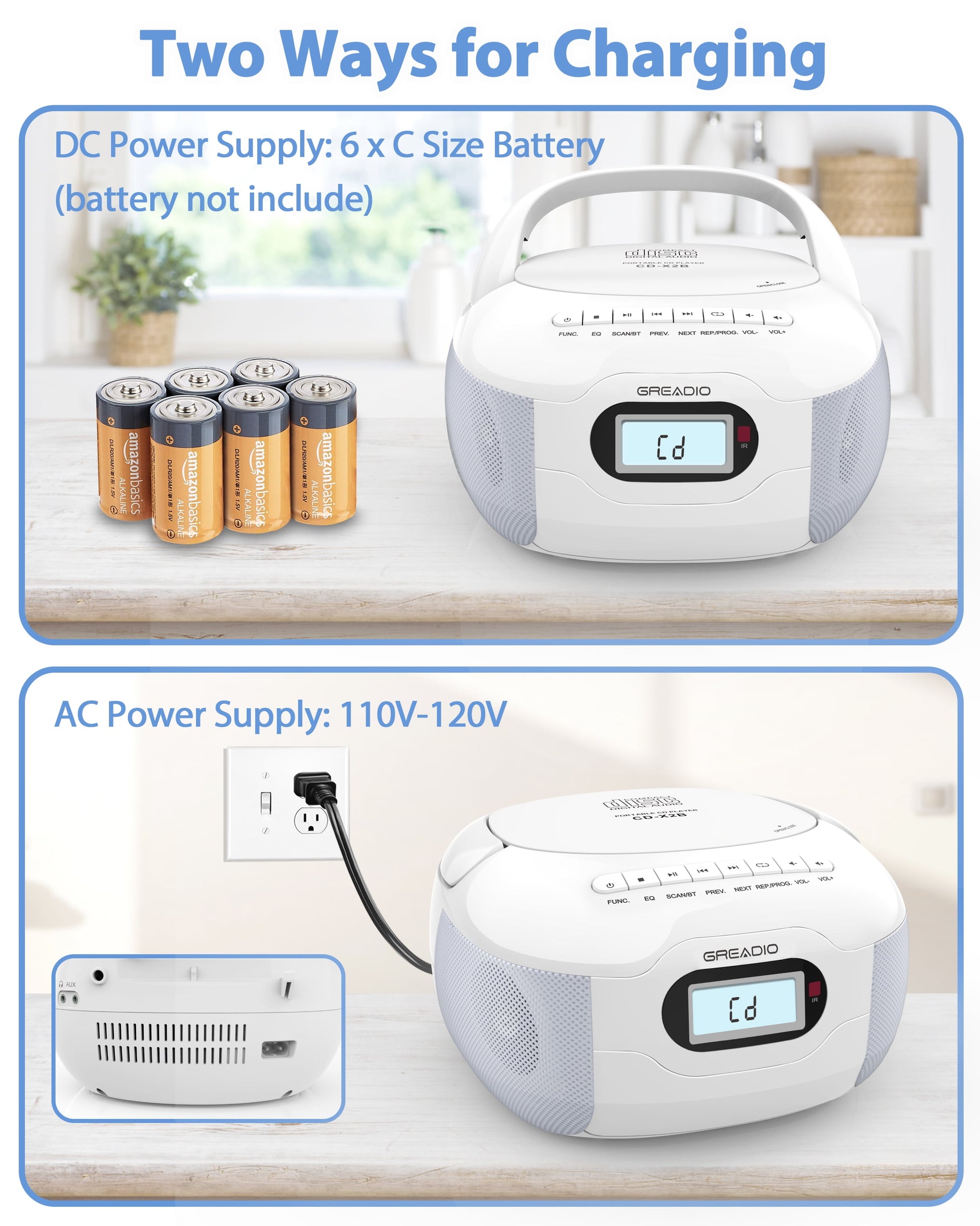 - Two Ways of Power Supply:Listen to your favorite music at home or in the kitchen when plugging the AC cable in the wall to charge this radio CD player. With six*C size batteries (battery not included), you can take this CD boombox to enjoy rich sound wherever you go like camping;party;picnic. The humanized handle design is perfect for you to take this boombox CD player out anytime anywhere. Great CD player boombox that suitable for kitchen;indoor;office;classroom or outdoor activities